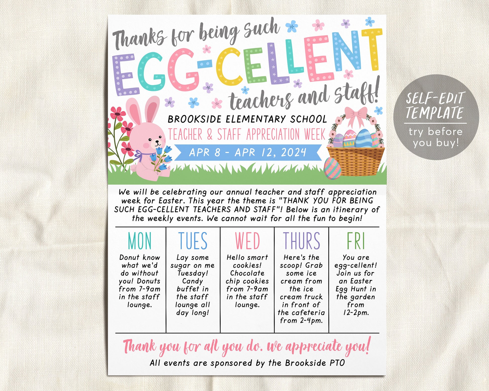 Source : www.etsy.comEaster Theme Teacher Staff Appreciation Week Itinerary Flyer